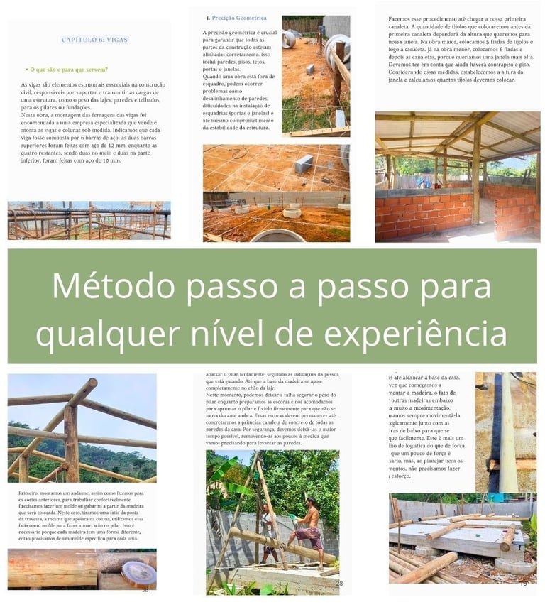 Não são apenas dicas soltas, mas sim instruções detalhadas e sequenciais para cada etapa da obra. É como ter em mãos o manual completo do fabricante. Tenha o mesmo conhecimento de quem fez as casas.